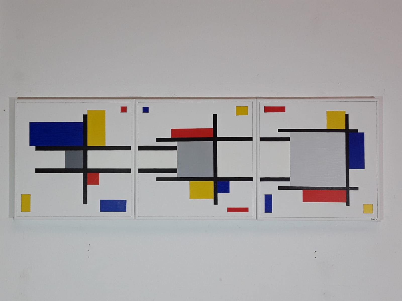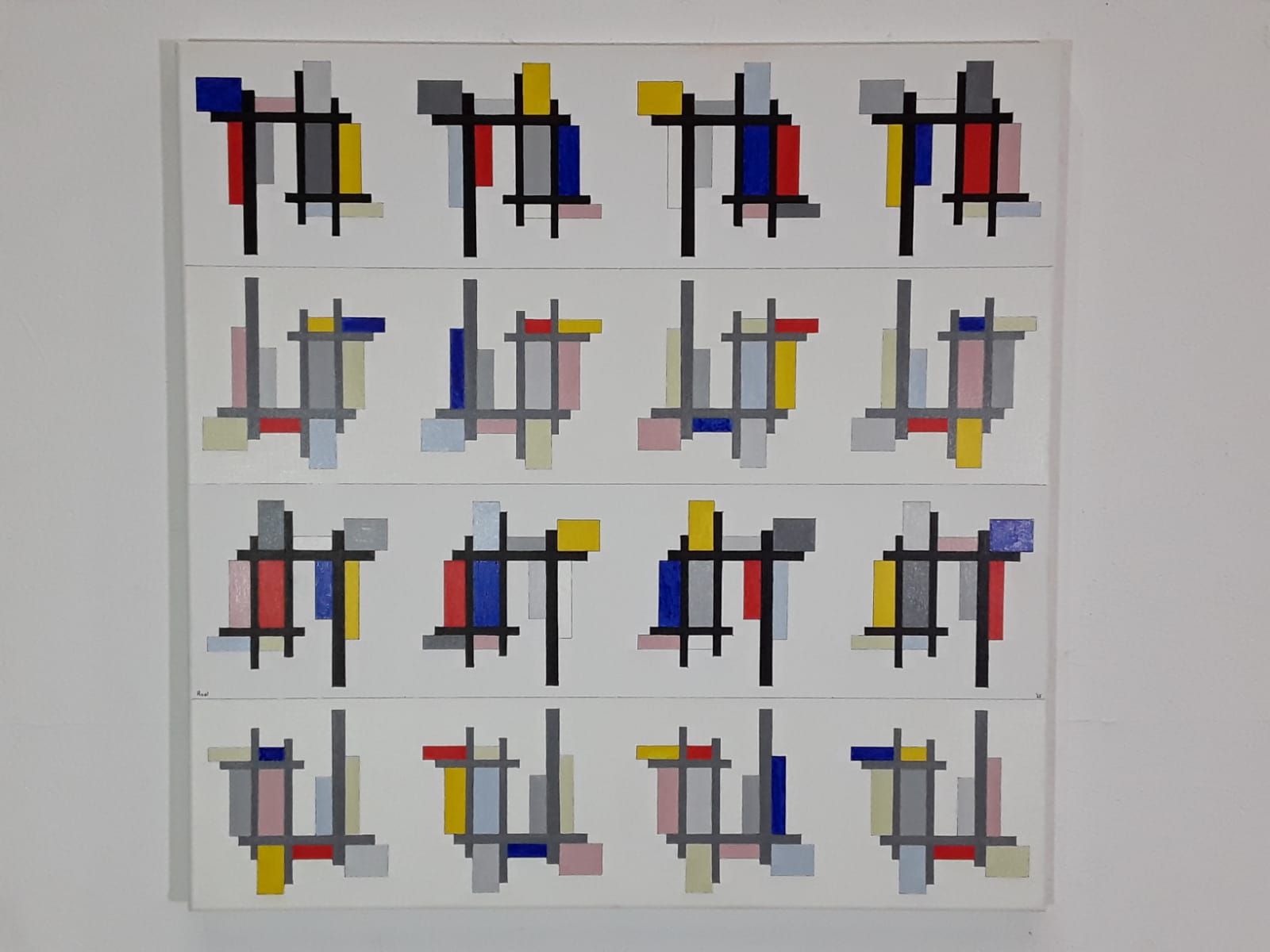 Echoes of Mondrian: Grey Compositions with Coloured Stripes. Artist: Roel. - Date: 2020. - 60 x 80 cm.
